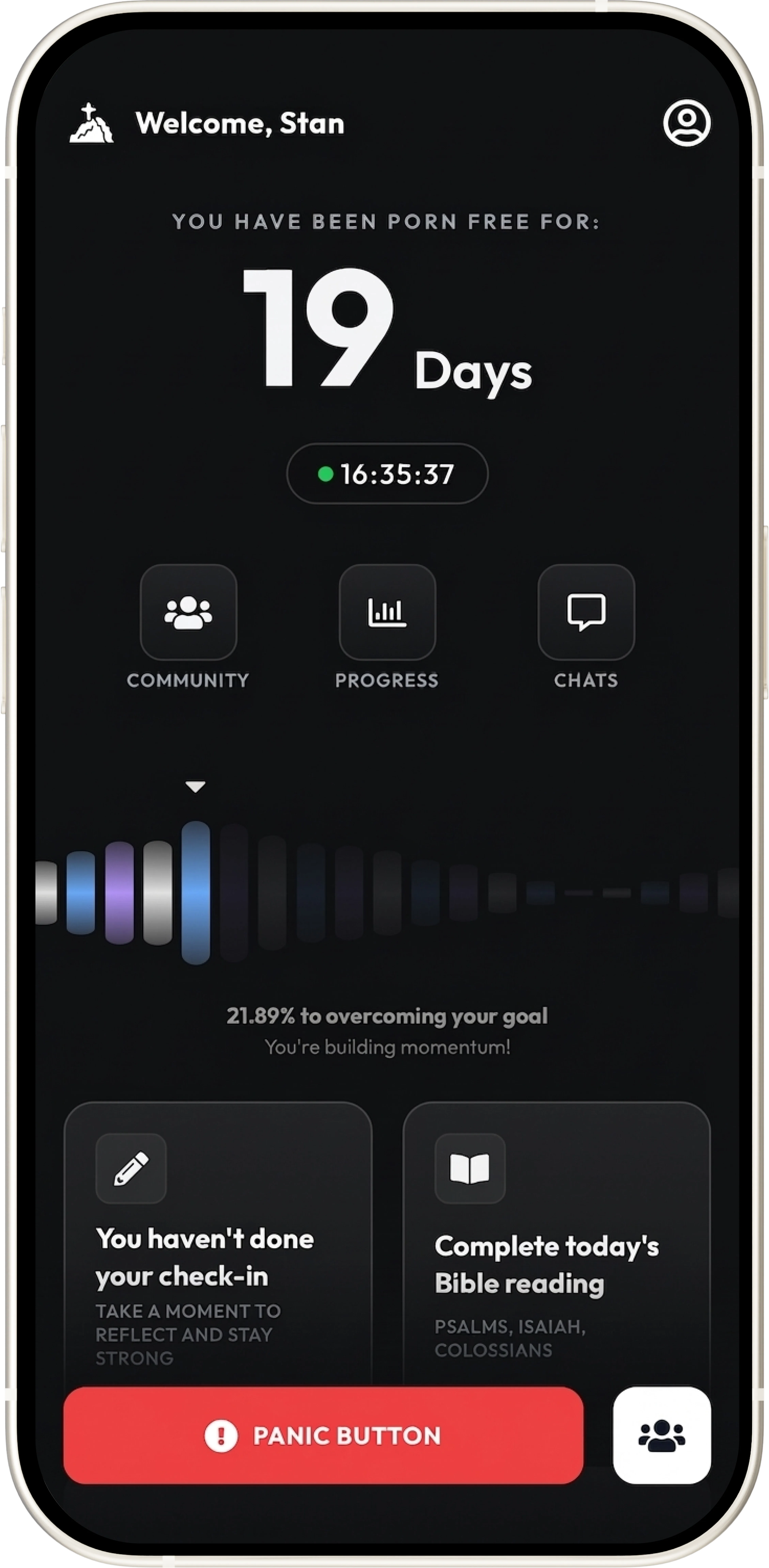 Sigue tu progreso con seguimientos diarios. Crea impulso mientras caminas el camino de la libertad.